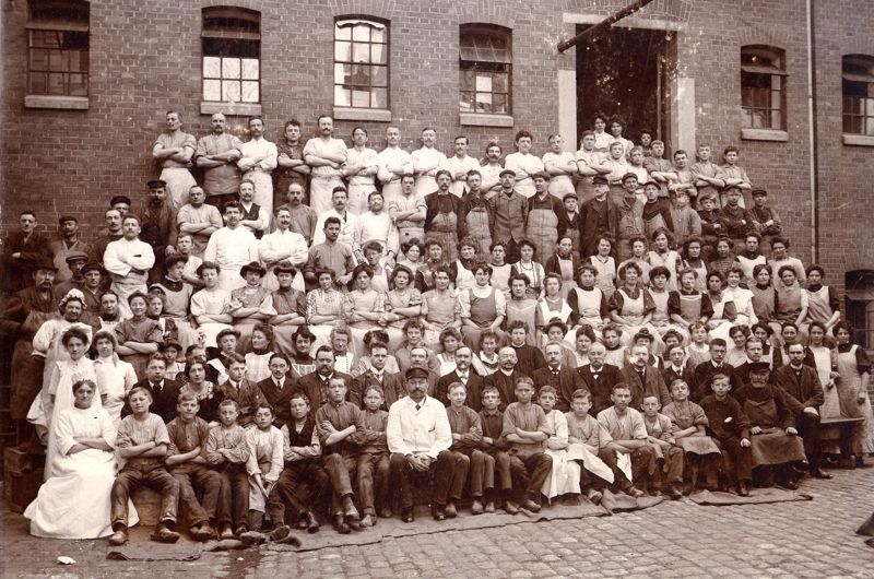 Billede: Personalet på chokoladefabrikken Elvirasminde i Klostergade i 1910. Fotograf Emil A. Tromholt, Den Gamle By.
