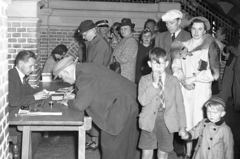Billede: Fra den 9. juni 1941 kunne aarhusianere afhente deres nu lovpligtige legimitationskort, der blev udleveret af Folkeregistret. På første dag afhentede 5.800 aarhusianere deres kort. På billedet bliver legimitationskort udleveret på Læssøesgades Skole. Ukendt fotograf, 1941, Aarhus Stadsarkiv.