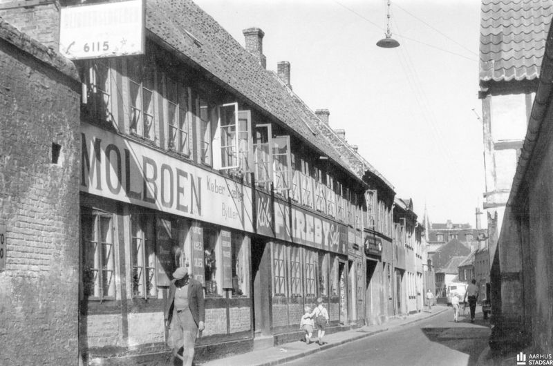Billede: Graven set Mejlgade. Til venstre ses nr. 3, som i slutningen af 1980’erne blev rekonstrueret. Fotograf Thomas Pedersen, 1955, Aarhus Stadsarkiv.