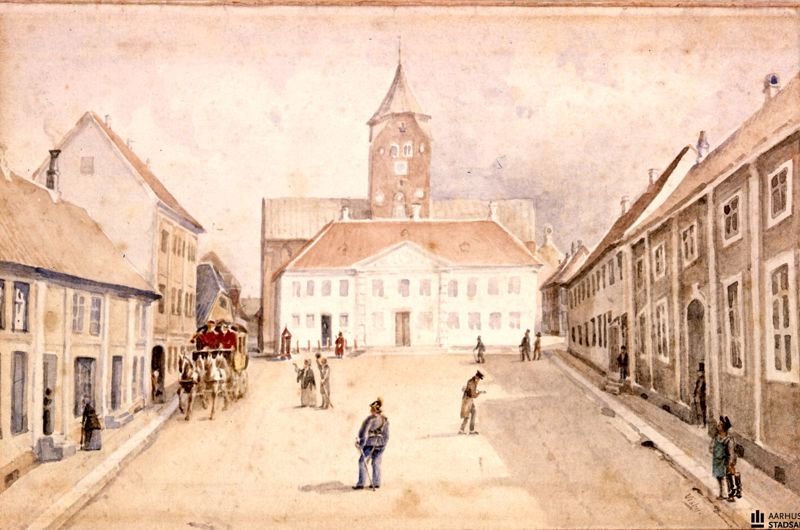 Billede: Store Torv set mod domkirken i 1840’erne med Mariane Levin stående i døren til sin modehandel i nr. 10 i husrækken til venstre. Akvarel af Hans Frederik Meyer Visby, ca. 1895, Aarhus Stadsarkiv.