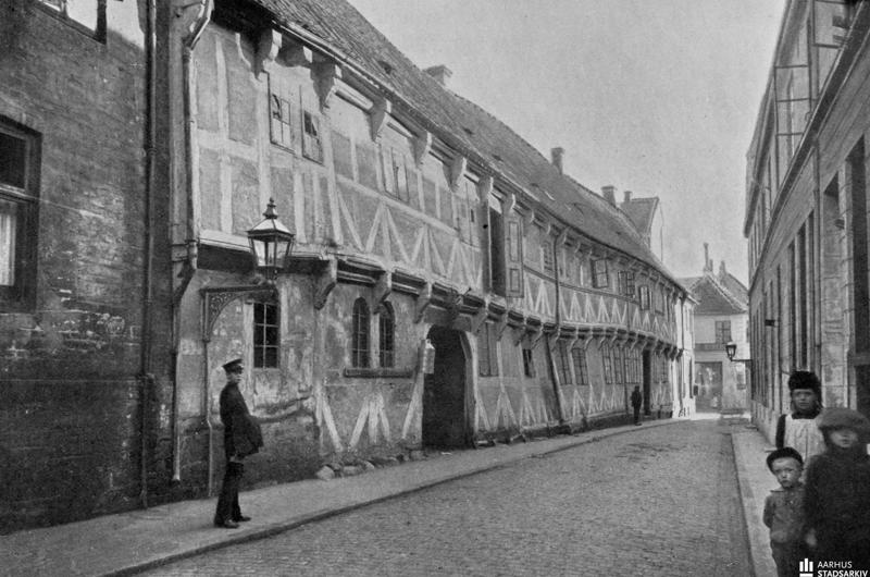 Billede: Marcus Bechs gård set fra Badstuegade, der i dag er genopført i Den Gamle By, set mod Store Torv i 1899. Fotograf Thorkil Svendsen, Aarhus Stadsarkiv.