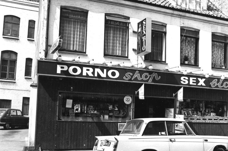Billede: Siden 1967 (halvandet år før pornografien i Danmark blev frigivet) har der været sexshop i Paradisgade 11. Ejendommen var i 2015 nedrivningstruet, men står endnu da det nye byggeprojekt ikke levede op til lokalplanens krav. Fotograf Poul Pedersen, ca. 1980, Aarhus Stadsarkiv.