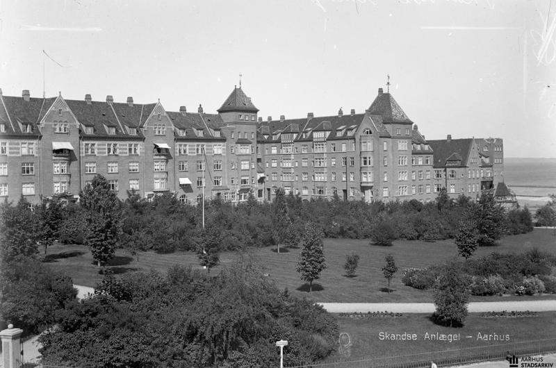 Billede: Skansepalæet, Skansen og Skanseparken fotograferet fra Hendrik Pontoppidans Gade. Hammerschmidt Foto, ca. 1914, Aarhus Stadsarkiv.