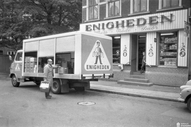 Billede: Mejeriudsalg fra Mejeriet Enigheden på Brammersgade 64. Fotograf Preben Hupfeld, 1971, Aarhus Stadsarkiv.