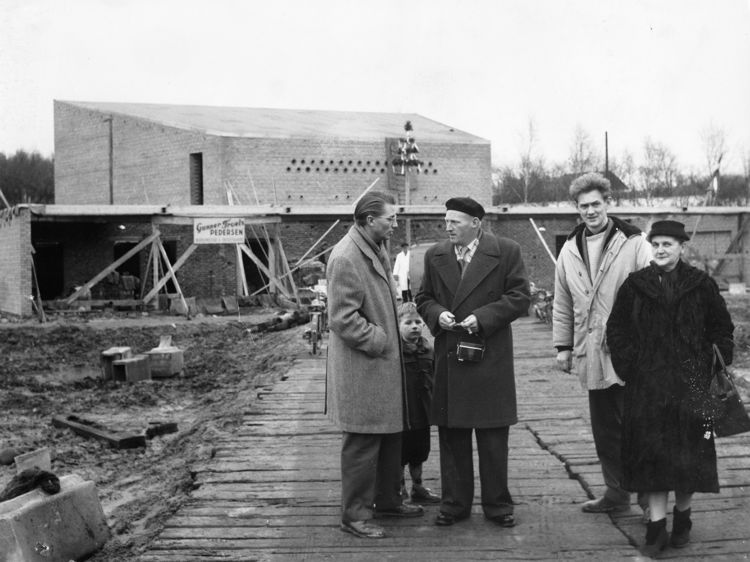 Billede: Rejsegilde på Vestteatret i Brabrand i 1957. Fra venstre: arkitekt Knud Blach Petersen, kommuneingeniør Berggren Jensen, arkitekt Knud Friis og kæmner og modstandskvinde fru Magda Baes Hansen. Fotograf Ib Rahbek-Clausen, 1957, Den Gamle By.