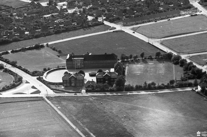 Billede: Åby Skole i ensom majestæt omgivet af enge og marker ved Åbyvej i starten af 1950’erne. Fotograf Børge Venge, Aarhus Stadsarkiv.