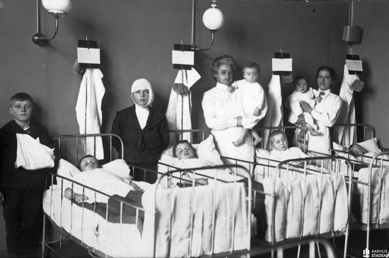 Billede: Sygeplejersker med indlagte børn på kommunehospitalet i starten af 1900-tallet. Ukendt fotograf, ca. 1912, Aarhus Stadsarkiv.