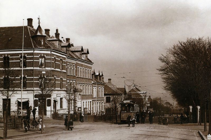 Billede: Trøjborgvej ved Tordenskjoldsgade omkring 1907 med sporvogn og legende børn. I højre side af billedet ses indgangen til Nordre Kirkegård. Ukendt fotograf, Aarhus Stadsarkiv.