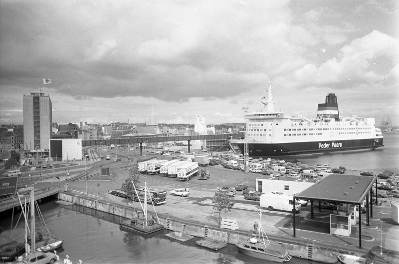Billede: Den store bilfærge Peder Paars ved kaj ved Aarhus Havnestation ved gamle dampskibsbro. Dokk1 er i dag opført på området, hvor havnestationen med dets parkeringspladser lå. Fotograf Jørn Timm, 1986, Aarhus Stadsarkiv