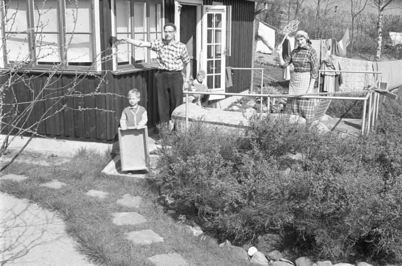 Billede: Rangerformand Åge Brock Jensen og hustru Gerda Jensen har gang i forårsrengøringen samt maling af deres sommerhus ved Tålfor Strand ved Skæring. Til dagligt boede familien på Paludan-Müllers Vej 14. Fotograf Børge Venge, 1959, Aarhus Stadsarkiv.