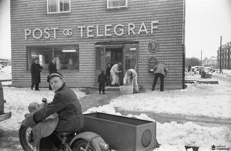 Billede: Håndværkere lægger sidste hånd på Christiansbjergs nye posthus på hjørnet af Hvidkløvervej og Jordbrovej inden indvielsen i december 1950. Fotograf Ib Hansen, Aarhus Stadsarkiv.