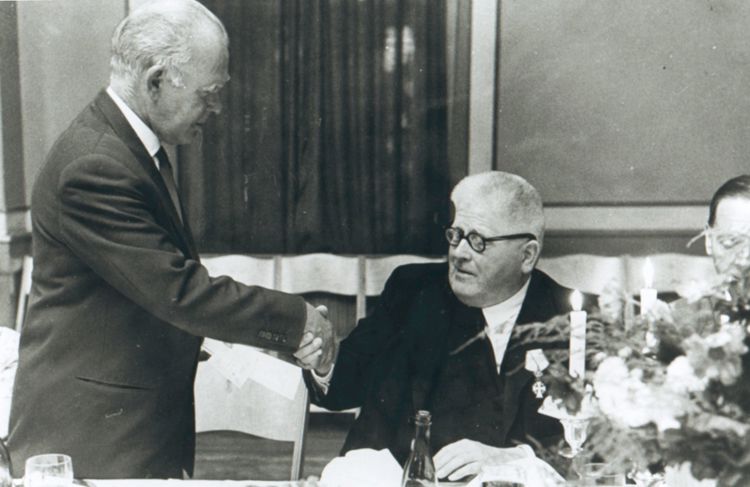 Billede: Brabrand Boligforening afholder 18-års stiftelsesfest i 1966 i selskabslokaler ved Edithsvej. Til venstre ses formand Ernst Valther Jørgensen. De øvrige er formand for foreningens byggeudvalg O.N. Justesen, forretningsfører Olaf Sørensen samt sognerådsformand Th. Jensen. Foto: Børge Venge, 1966, Den Gamle By.