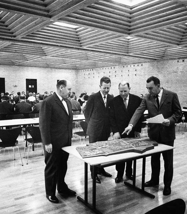 Billede: Rejsegilde på Vestteatret i Brabrand i 1957. Fra venstre: arkitekt Knud Blach Petersen, kommuneingeniør Berggren Jensen, arkitekt Knud Friis og kæmner og modstandskvinde fru Magda Baes Hansen. Fotograf Ib Rahbek-Clausen, 1957, Den Gamle By.