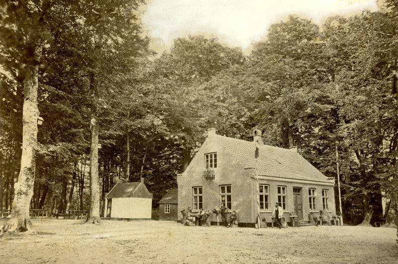 Billede: Det gamle skovfogedhus i Riis Skov en søndag i midten af 1800-tallet. Skovfogedhuset lå, hvor vandrehjemmet ligger i dag. Fotograf Frederik Visby, ca. 1860, Aarhus Stadsarkiv