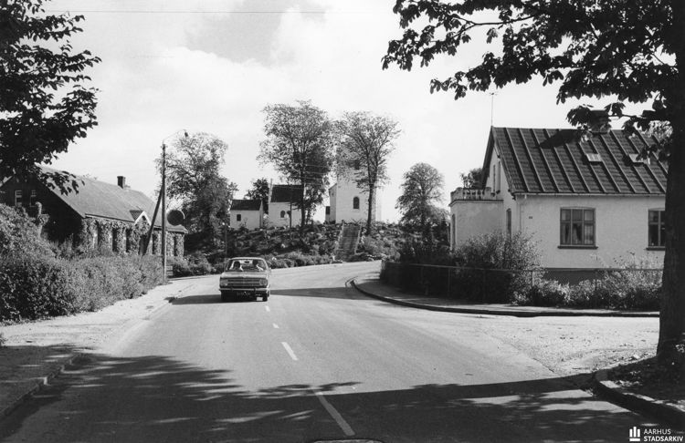 Billede: Nedergårdsvej i landsbyen Skejby set fra vest. Til venstre ses Nedergårdsvej 36, det omkring 1930 nedlagte forsamlingshus. I midten af billedet ses Skejby Kirke. Fotograf Kurt Jensen, 1974, Aarhus Stadsarkiv