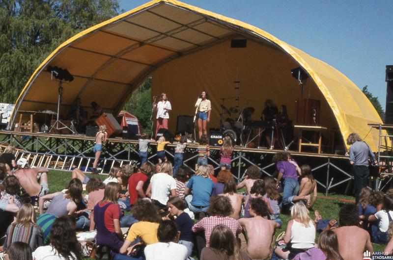 I 1977 var der rød rock i Botanisk Have, da Dansk Kommunistisk Ungdom afholdt Rock Festival. På programmet var blandt andet de lokale Shit og Chanel, Delta Blues og Big Joe Band. På scenen var der også politiske taler med blandt andre formanden for Danmarks Kommunistiske Parti, Knud Jespersen, og ved boder kunne man spille ”Knald Pinochet” eller købe mad lavet af chilenske flygtninge. Fotograf Lars Kristian Olesen, 1977, Aarhus Stadsarkiv.