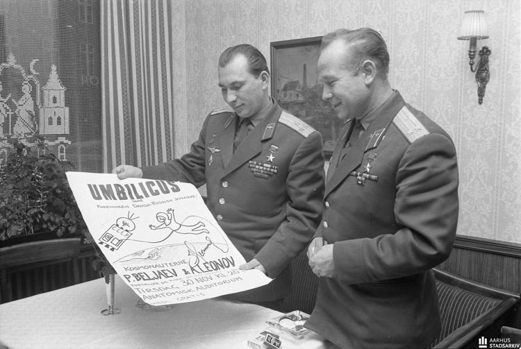 Billede: Astronauterne Aleksej Arkhipovitj Leonov og Pavel Ivanovitj Beljaev (Beljajev) besøger Aarhus. Her ses de på Aarhus Rådhus. I Aarhus holdt de blandt andet oplæg på Anatomisk Institut, hvor de berettede om deres rumfærd. Oplægget var arrangeret af Umbilicus, medicinernes fredagsbar, i samarbejde med Dansk-Russisk Samvirke. Fotograf Børge Venge, 1965, Aarhus Stadsarkiv.