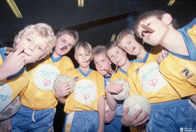 Billede: Drenge fra Vejlby-Risskovs Idrætsklub er ambassadører for antirygekampagnen "Rigtige idrætsfolk er røgfri - hvor fri er du?" Fotograf Preben Hupfeld, 1991, Aarhus Stadsarkiv.