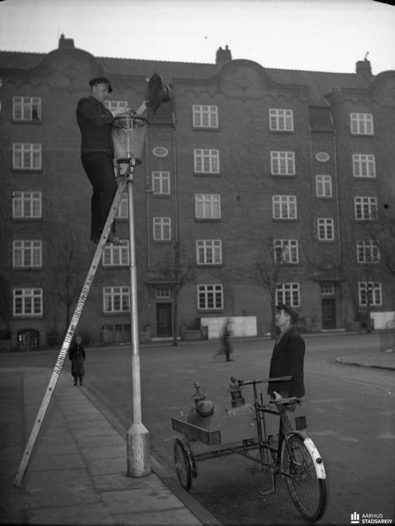Billede: Ansatte fra Aarhus Belysningsvæsen afmonterer hætter på byens gaslygter - her ved Chr. Kiers Plads med De Mezas Vejs ejendomme i baggrunden. Afmonteringen skete grundet omfattende tyveri af kobberhætterne under besættelsen. Ukendt fotograf, 1941, Aarhus Stadsarkiv.