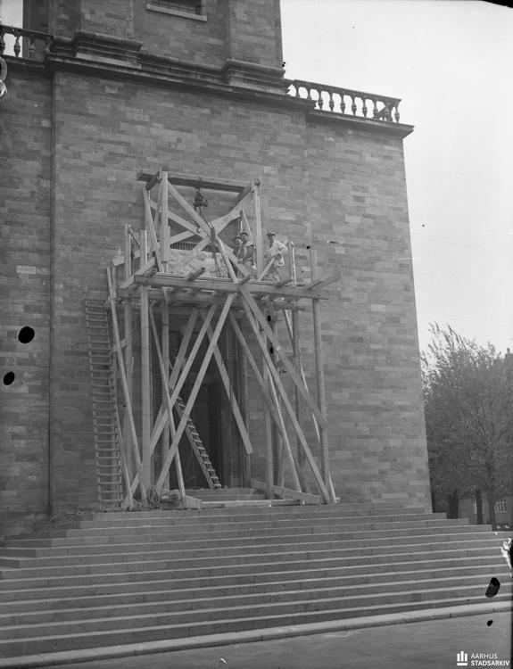 Billede: Relief over hovedindgangen til Sankt Lukas Kirke sættes på plads. Relieffet er udført i sandsten af billedhugger Rasmus Harboe og vejer halvanden ton og forestiller Kristus og den fortabte søn. Ukendt fotograf, 1940, Aarhus Stadsarkiv.