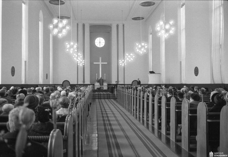 Billede: Menigheden til gudstjeneste i Sankt Lukas Kirke i 1970, hvor domprovst Jørgen Bøgh pastor indsatte H. Krogh Christensen som sognepræst ved kirken. Fotograf Jørn Timm, Aarhus Stadsarkiv.