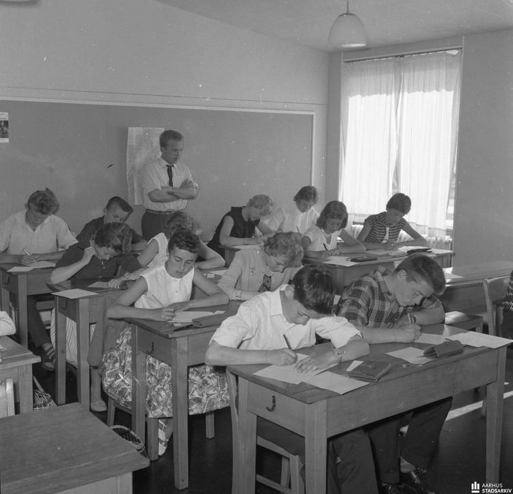 Billede: 3. mellem A fra Møllevangskolen til eksamen i dansk stil, mens lærer Poul Jørgensen ser til. Emnet for stilen var "Fortæl om nogle udenlandske frugter, som indføres i Danmark" eller "Fortæl om nogle befordringsmidler, som anvendes i Danmark". Fotograf Børge Venge, 1959, Aarhus Stadsarkiv.