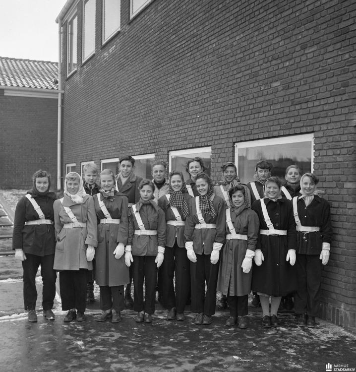 Billede: Skolepatruljen på Møllevangskolen fejrer sit 1-års jubilæum. Fotograf Børge Venge, 1954, Aarhus Stadsarkiv.