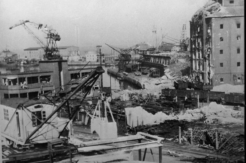 Fotografiet viser ødelæggelser på havnen efter 4. juli-katastrofen, hvor en tysk lægter ladet med ammunition sprang i luften i 1944. Der ses blandt andet ødelæggelse på Oliefabrikkens siloer til højre i billedet.