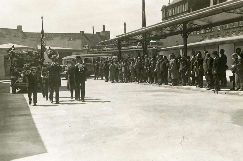 Øverste billede: Byens nye rutebilsstation indvies med blæseinstrumenter og taler i 1930. E. A. Ebbesen, Den Gamle By.