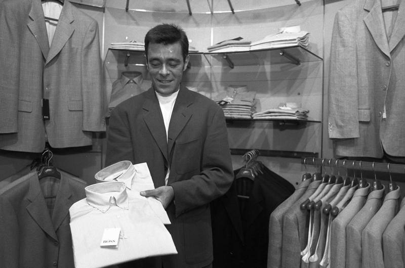 Billedtekst: Herretøjsbutikken Kaufmann på Strøget i Aarhus forhandler eksklusive tøjmærker og dyrt modetøj. Her viser ekspedient Kim Hartvig i juni 1994 skjorter frem for fotograf Jens Tønnesen. Fotograf Jens Tønnesen, 1994, Aarhus Stadsarkiv.'