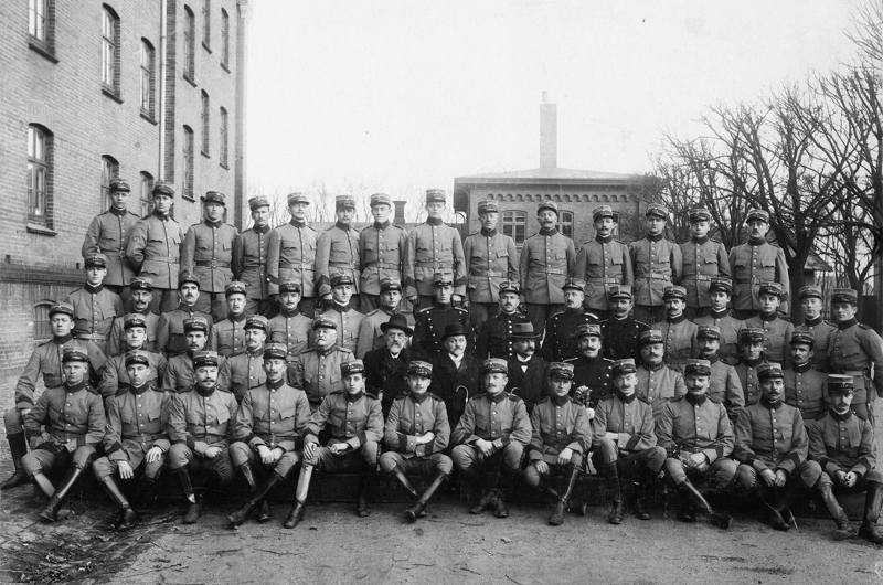Foto: Gruppebillede af Aarhus Amts Rekylkorps ved Høegh Guldbergs Gades Kaserne i 1914, to år efter dannelsen. Den Gamle Bys billedarkiv, 1914.