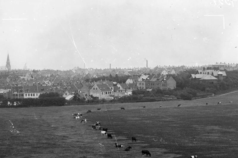 På billedet ses den nye bydel Frederiksbjerg fotograferet i 1898. Fra 1870 til år 1900 voksede Frederiksbjerg fra 300 til 10.000 indbyggere. Billedet er taget fra Magdalenemøllen, der lå hvor Marselisborg Hospital senere blev bygget, ud over Marselisborg Mark, hvor blandt andet Ingerslevs Boulevard i dag ligger. Hammerschmidt Foto, 1898, Aarhus Stadsarkiv.