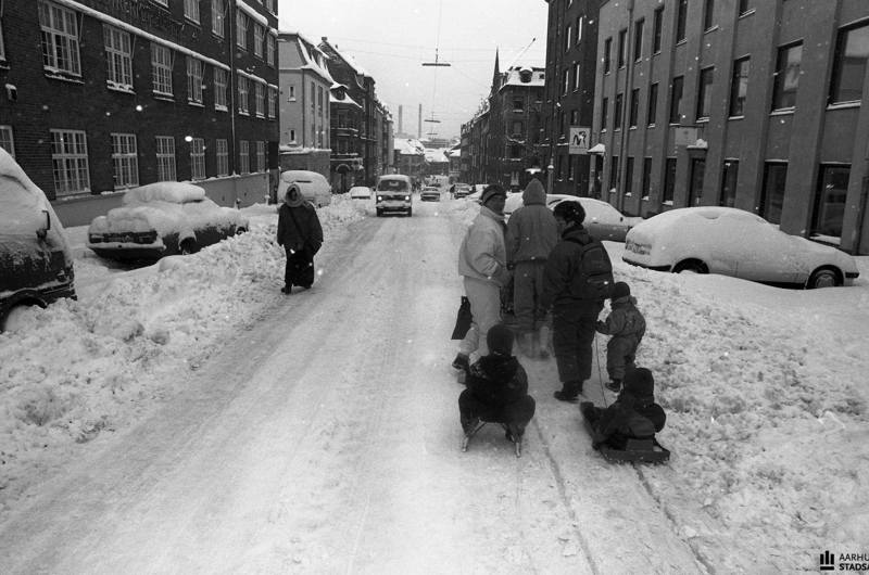 Billedtekst: Man kan kun håbe på en hvid jul og mulighed for en kælketur ned ad den snedækkede Grønnegade i midtbyen som her i vinteren 1994. Fotograf: Jens Tønnesen, Aarhus Stadsarkiv.