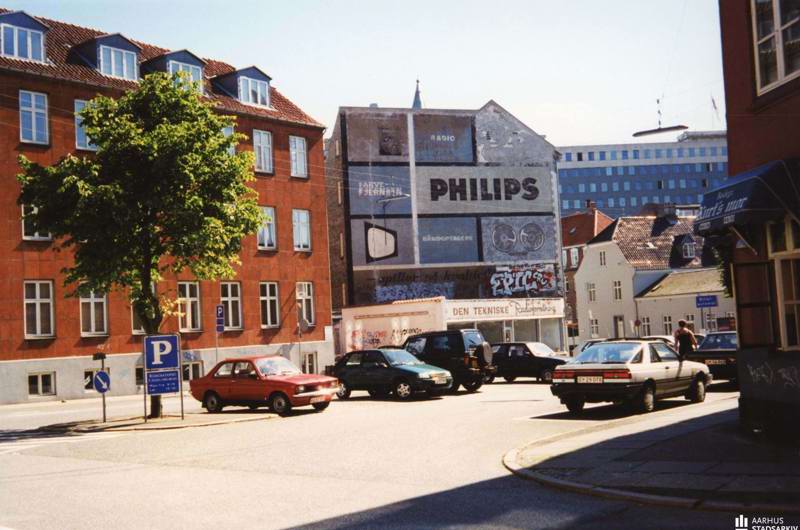 Billede: Fredens Torv set fra hjørnet ved bodegaen Kurts Mor i juli 1999. Torvet var på det tidspunkt godt slidt. Den røde bygning gemmer på en af arkitekten Vilhelm Schrøders senklassicistiske bygninger i nr. 6, der i 1942 havde fået en ekstra etage påmuret. Torvet er helt domineret af biler og den store gavlreklame. Fotograf: Anita Strømberg Kimborg, 1999.