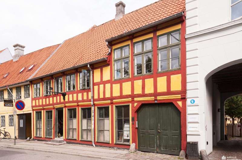 Billede: Den smukke 1700-tals bindingsværksgård på Klostergade 58 blev fredet i 1970. Fotograf Ib Nicolajsen, 2015, Aarhus Stadsarkiv.