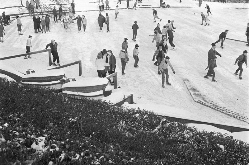 Billede: Skøjteløb på bådesøen i Folkeparken Friheden. Fotograf Børge Venge, 1960, Aarhus Stadsarkiv.