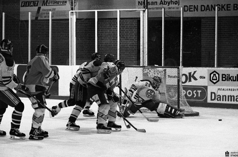 Billede: Ishockeykamp mellem Aarhus og Frederikshavn i Aarhus Skøjtehal i 1995. Fotograf Jens Tønnesen, Aarhus Stadsarkiv.