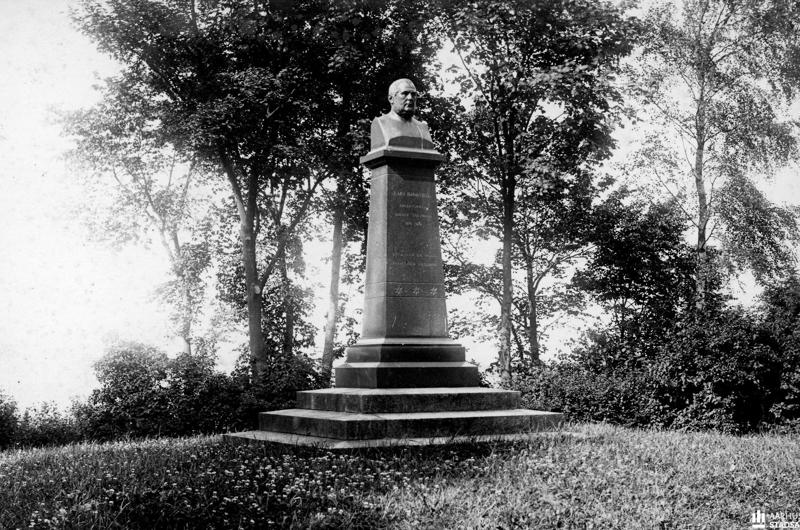 Billede: Lars Bjørnbaks mindestøtte, som står i byparken i Viby, blev rejst af hans venner i 1880. Busten er lavet af Jens Adolph Jerichau. Ukendt fotograf, ca. 1890, Aarhus Stadsarkiv.