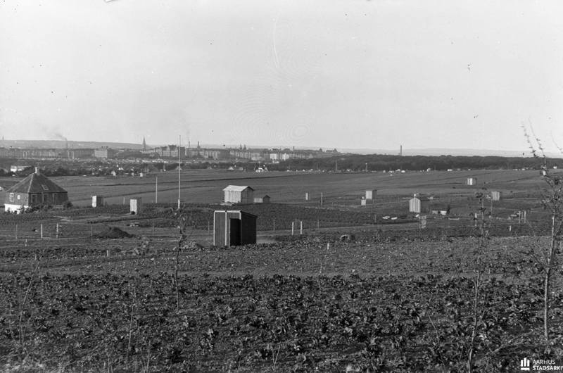 Billede: Udsigt fra det endnu ubebyggede Fredensvang over Rosenvang og Aarhus. Til venstre i billedet ses den nyopførte villa på Bakholmsvej 2. Ukendt fotograf, ca. 1922, Aarhus Stadsarkiv.