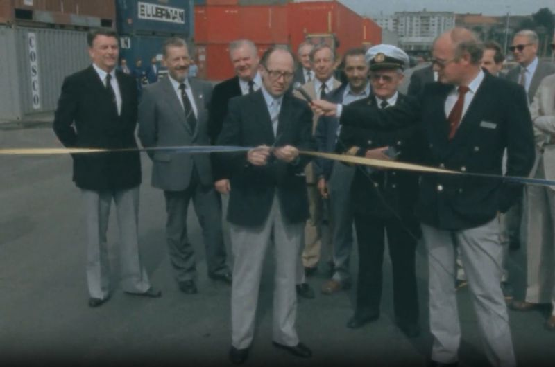 Billede: Screenshot fra filmen, hvor borgmester Thorkild Simonsen indvier en udvidelse af containerterminalen.
